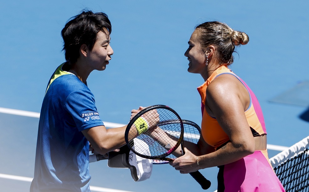 1月21日,中国选手白卓璇(左)与白俄罗斯选手萨巴伦卡赛后握手致意。新华社发